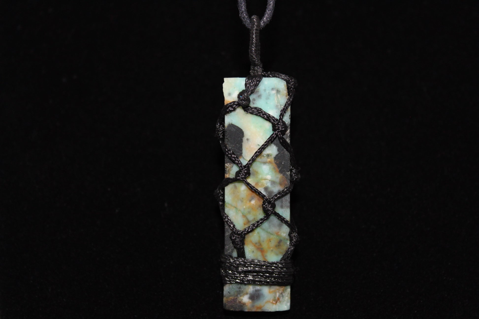 This beautiful Chrysocolla Pendant is wrapped in a cotton macrame net and is 70-75mm (l) x 20-30mm (w) - includes a free, adjustable black cotton necklace.