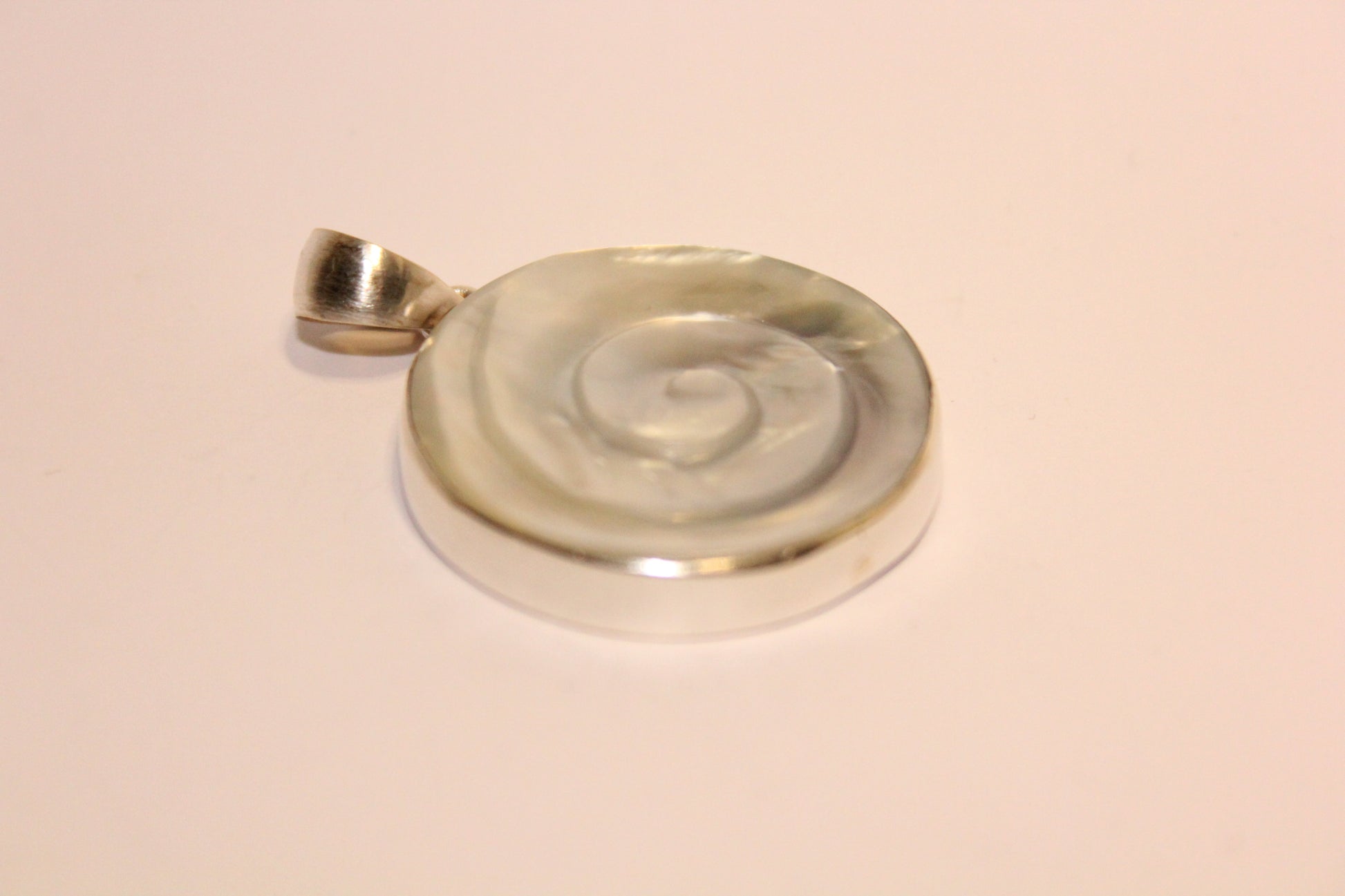 This beautiful Mother of Pearl Pendant is set in Stirling Silver and is approx - 50mm (l) x 35mm (w).
