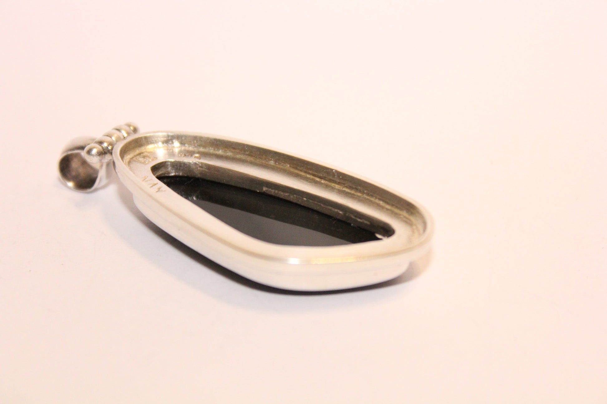 This beautiful Obsidian Pendant is set in Stirling Silver and is approx - 60mm (l) x 25mm (w).
