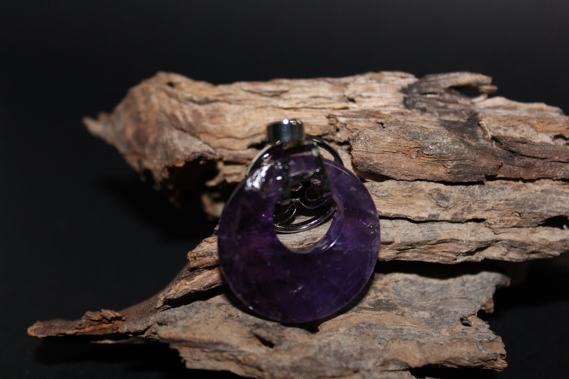 This Amethyst Donut style Pendant is set with an OM design and is approx - 40mm (l) x 30mm (w). Includes adjustable black cotton necklace.