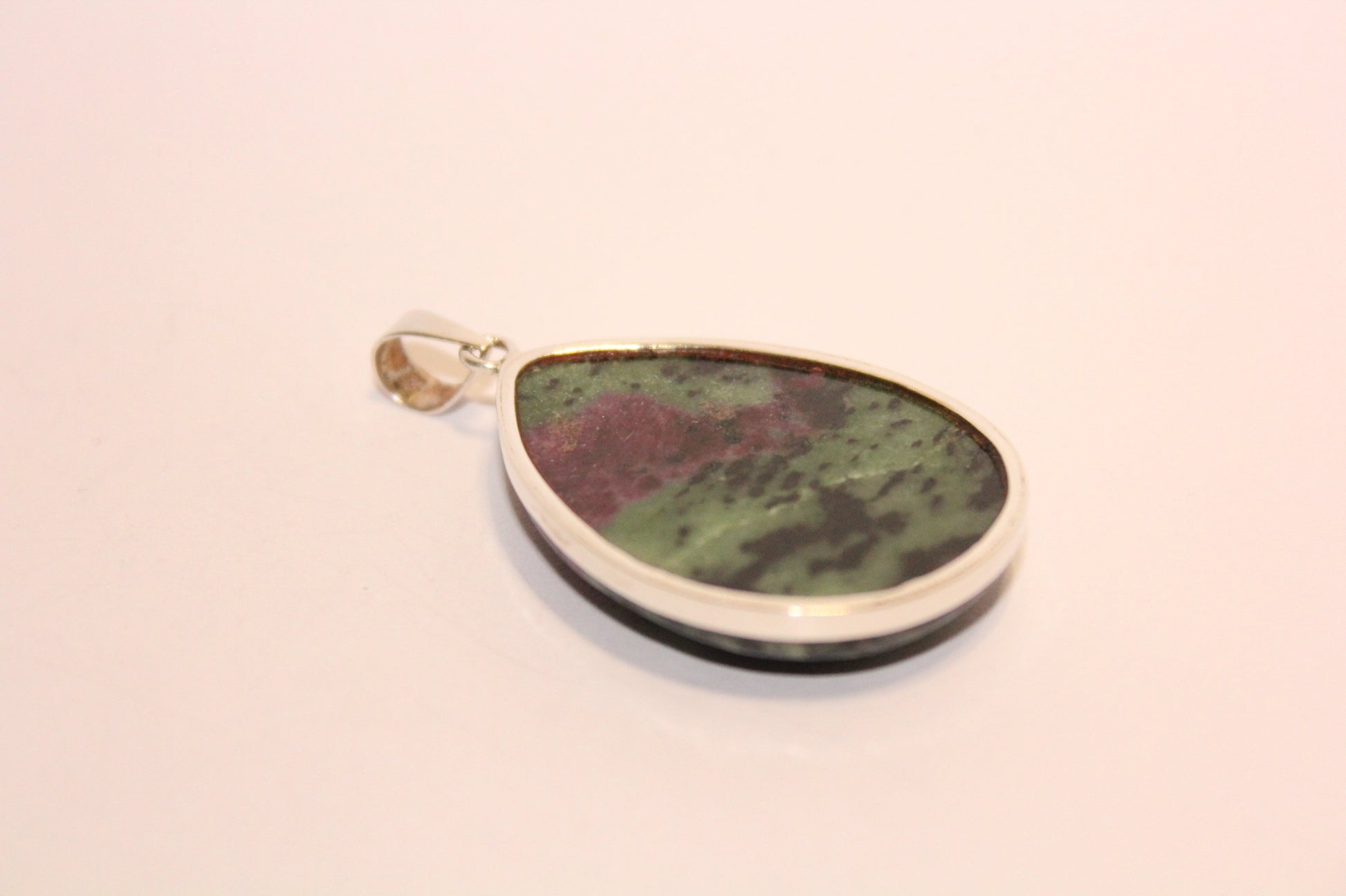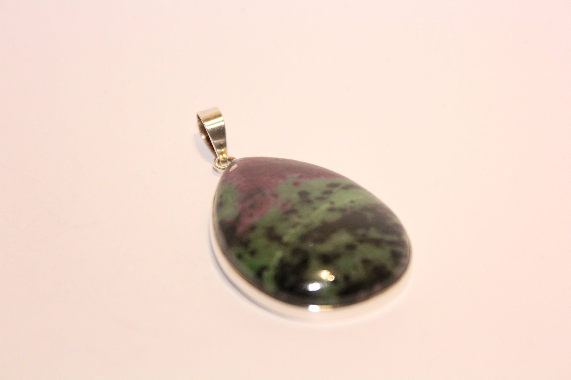 This beautiful Ruby In Zoizite Pendant is set in Stirling Silver and is approx - 50mm (l) x 32mm (w).