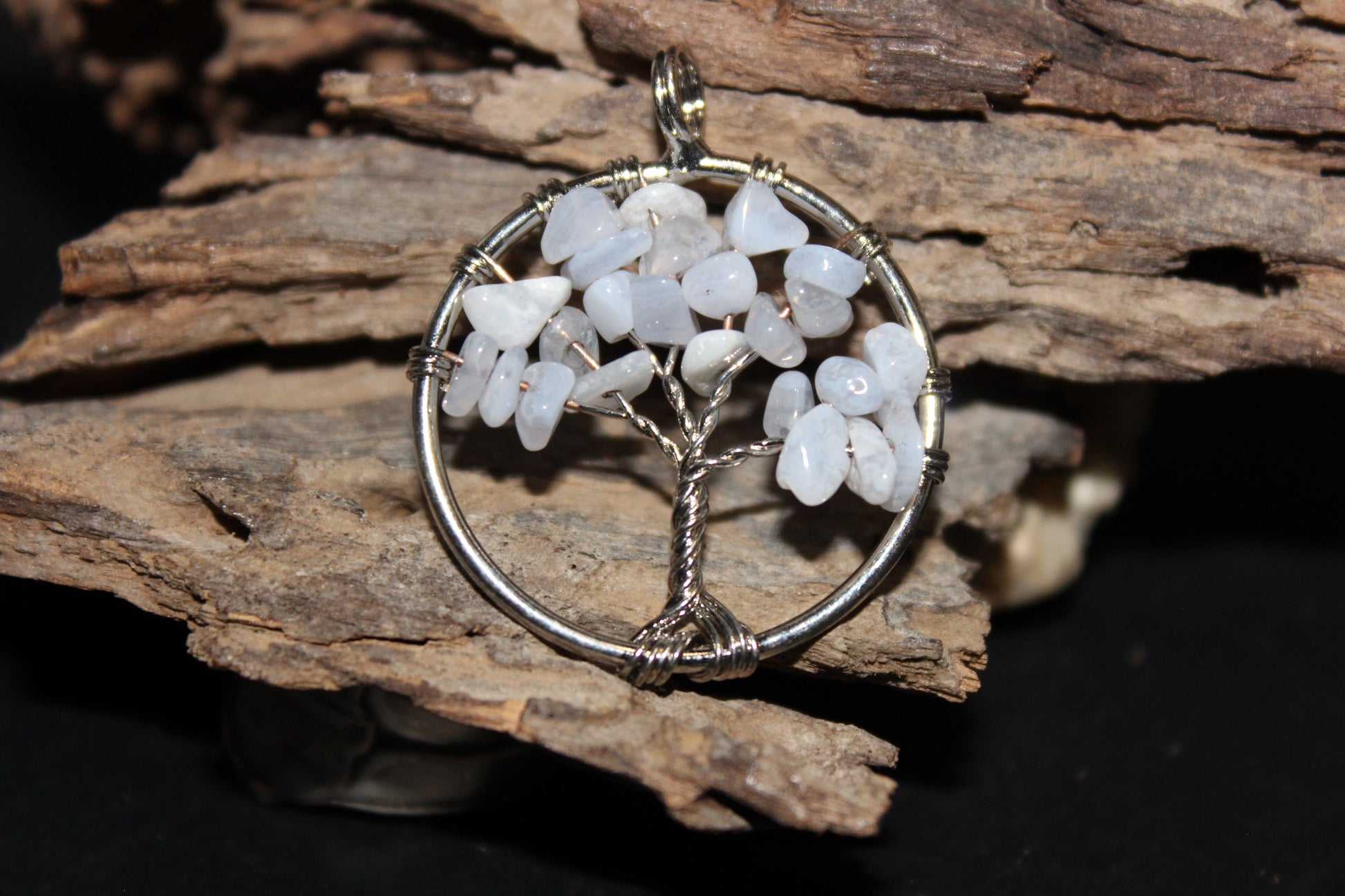 This beautiful Blue Lace Agate Pendant is set in a Tree Of Life design and is approx - 35mm (l) x 30mm (w). Includes adjustable black cotton necklace.