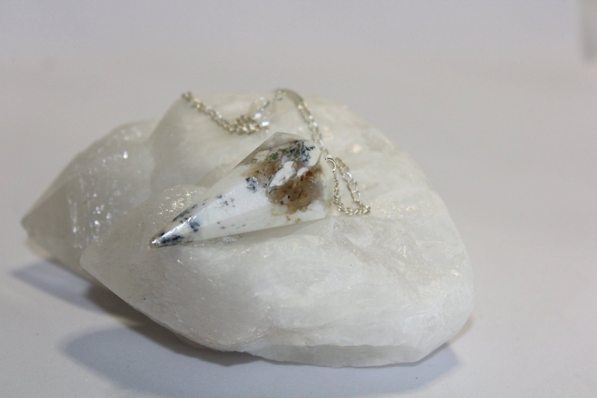 Get in touch with your 'higher-consciousness' by dowsing with this beautiful Merlinite pendulum - 40mm (length) - 20mm (top diameter).
