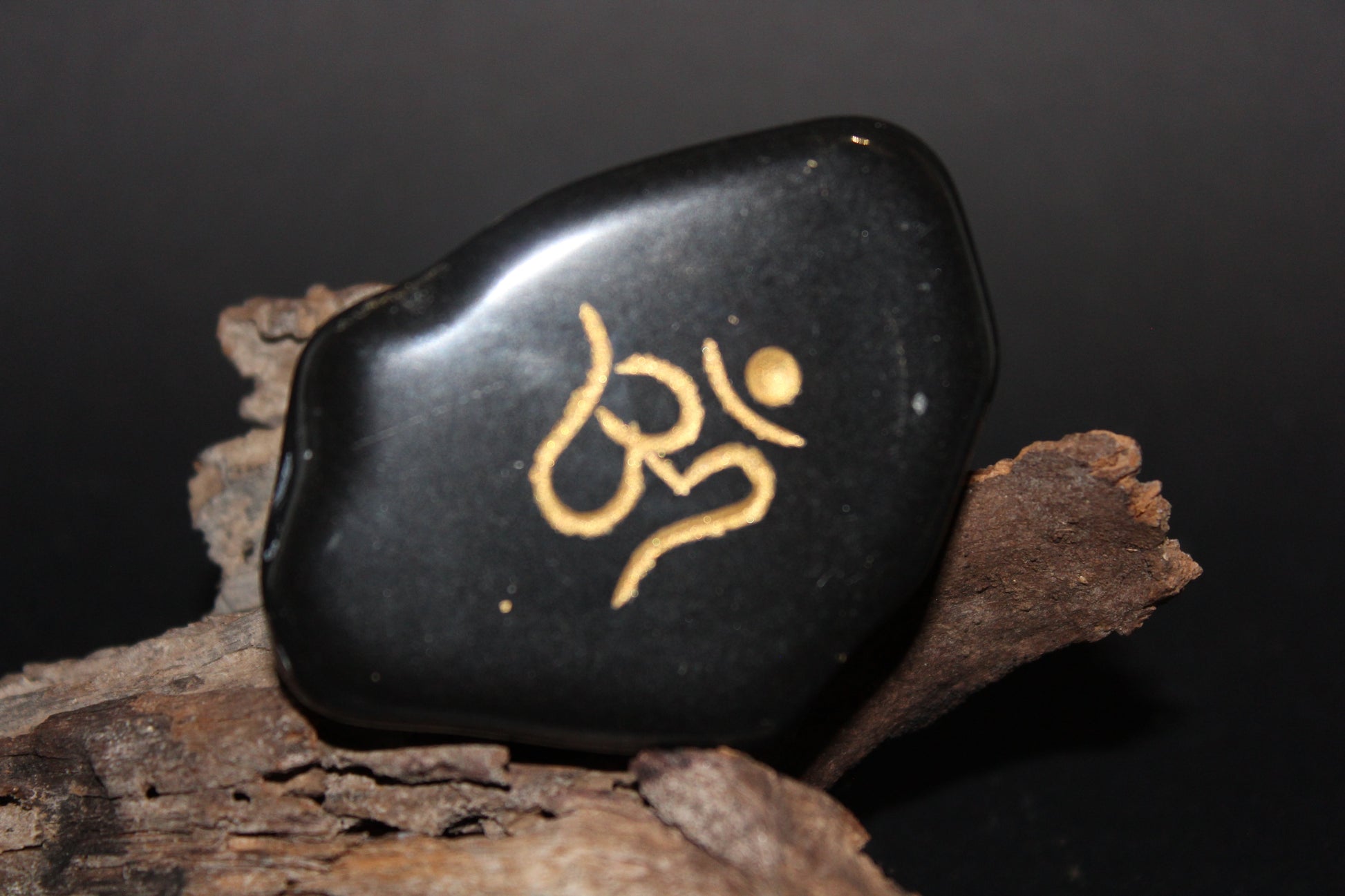 A beautiful Onyx slice is adorned with a carved OM symbol - 65mm (l) x 50mm (w) x 5mm (d) and 48gms.