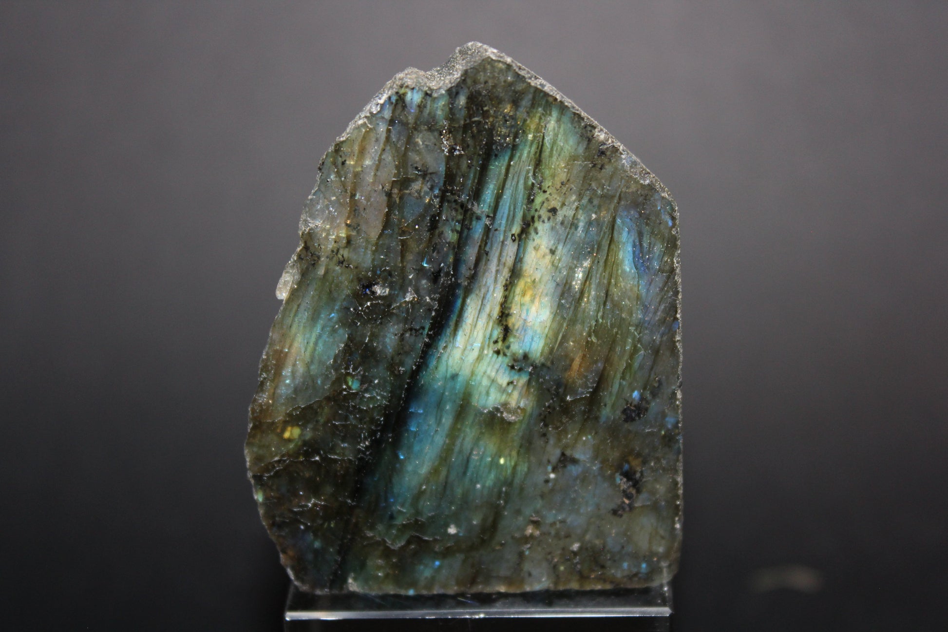 This beautiful 1/2 polished, 1/2 raw Labradorite freeform stand is 55mm (h) x 40mm (w) x 20mm (d) and 64gms.