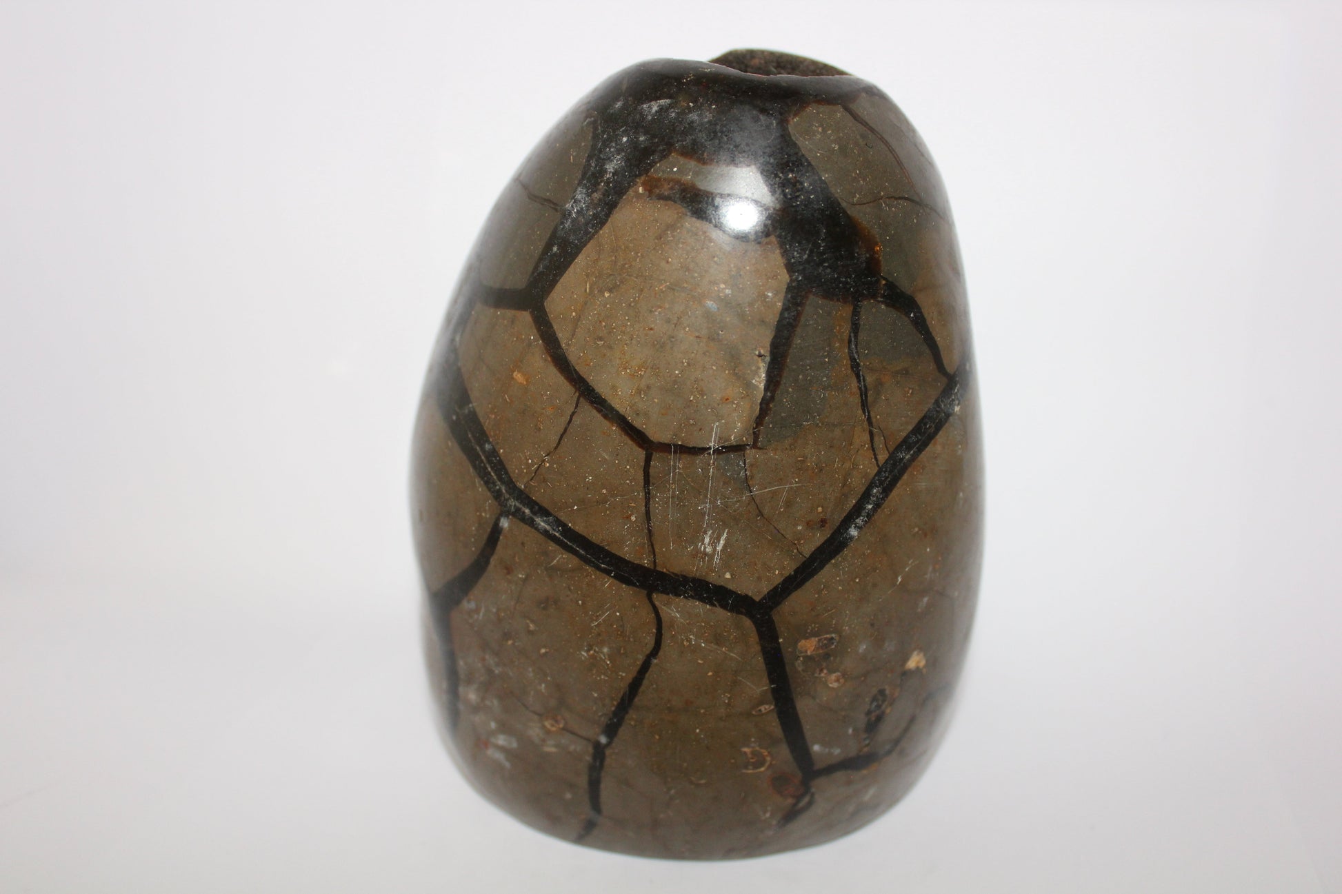 This beautiful polished Septarian freeform stand has been creatively left open and is 150mm (h) x 100mm (w) x 90mm (d) and 2250gms.