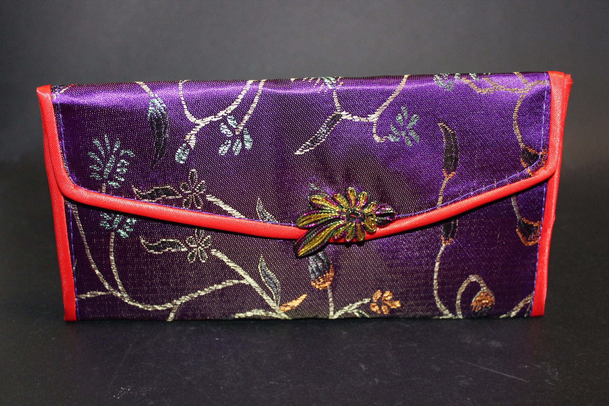 Embroidered Silk wallet (trifold with clip, 1 zippered pocket and one open pocket inside). Blue - 180mm x 85mm.