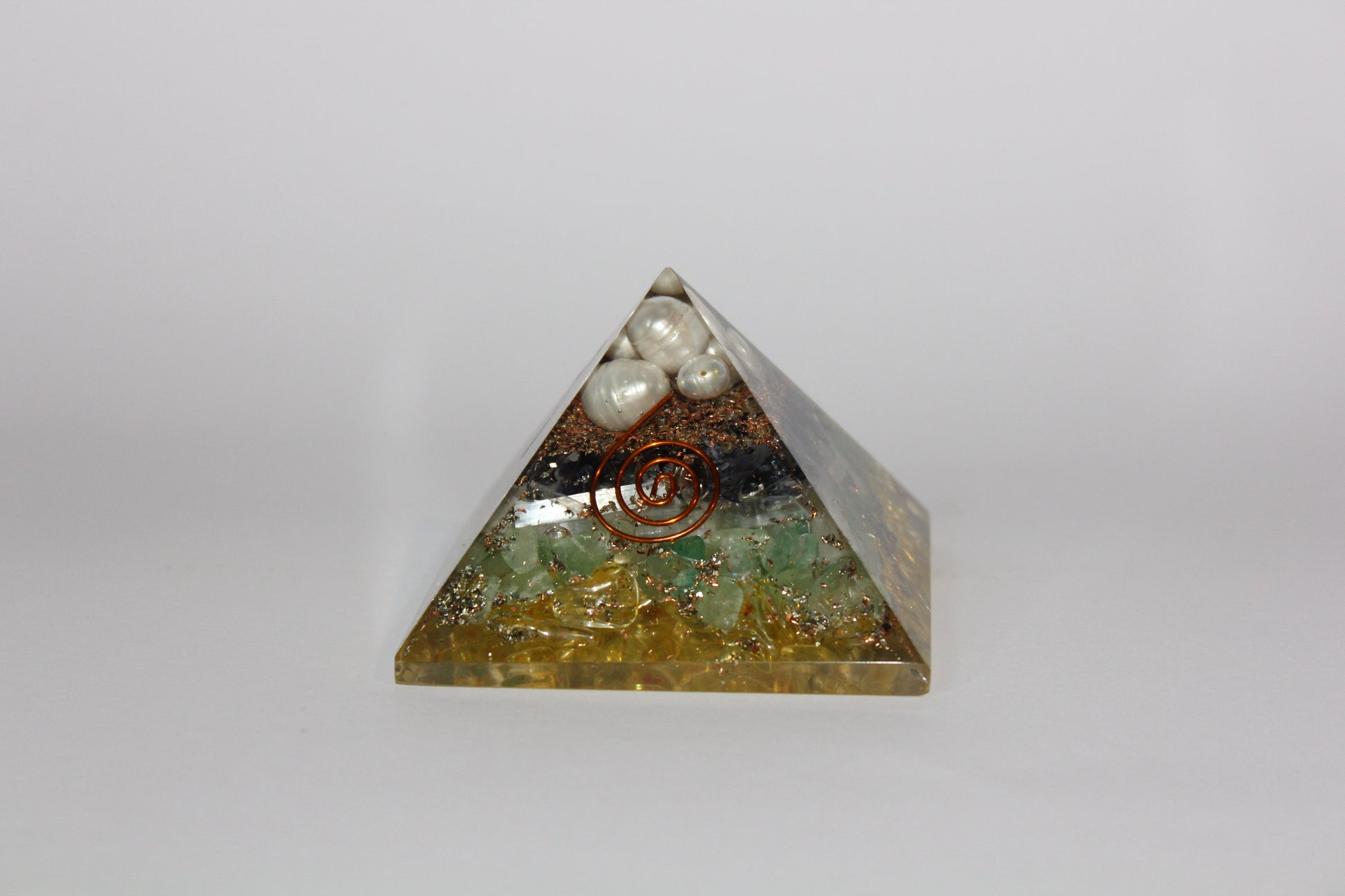 Orgonite Pyramid containing citrine, pearl, selenite, amethyst and aquamarine.