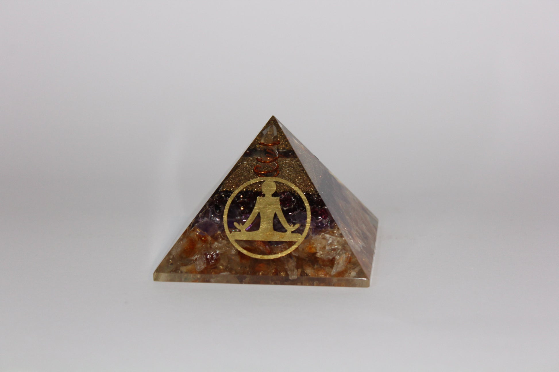 Orgonite Pyramid containing garnet, citrine, amethyst, clear quartz and adorned with the Yoga Pose.