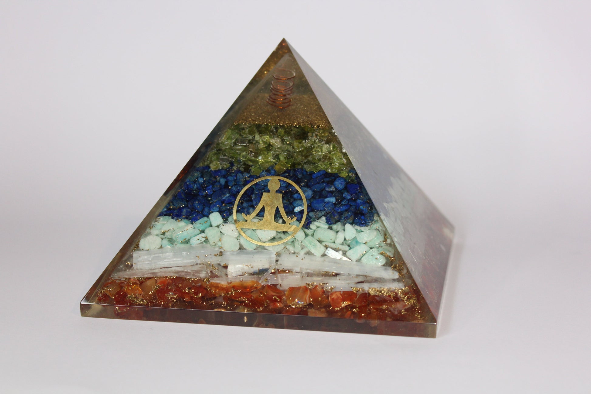 Orgonite Pyramid containing carnelian, selenite, amazonite, lapis lazuli, peridot and adorned with the Sri Yantra & Yoga Pose.