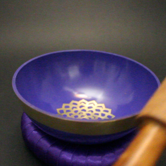 This Singing Bowl is 11cm - diameter x 4cm - high and represents the Crown Chakra - Purple in colour - This beautifully boxed gift set includes a wooden dorge/striker and donut ring cushion.