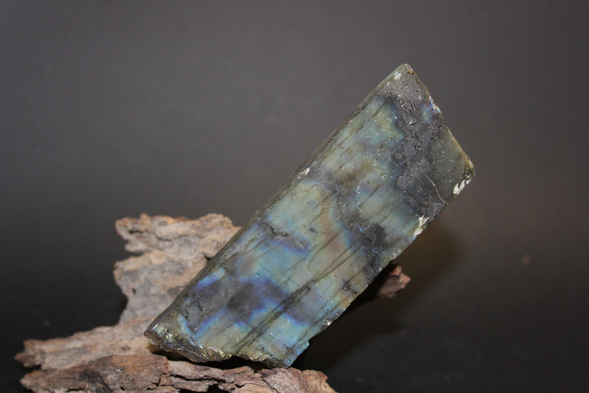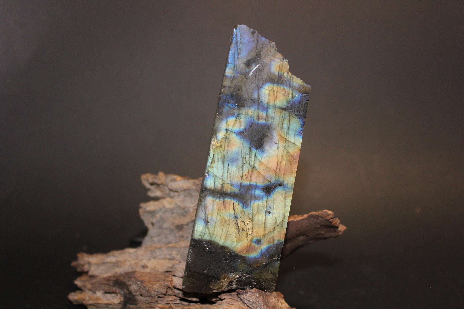 Raw Labradorite slice, with spectacular colours. Approx. 100mm (h) x 35mm (w) x 12mm (d) and 73gms.