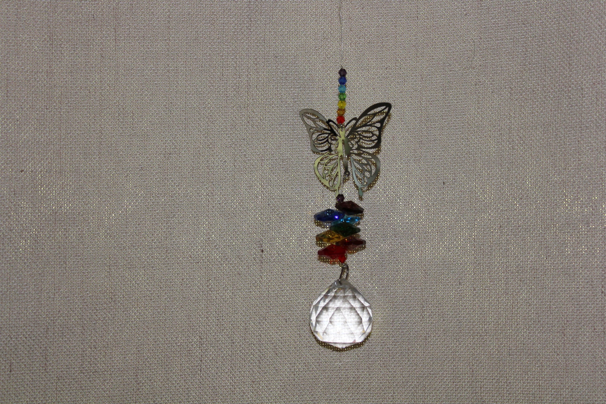 This beautiful suncatcher has a butterfly with chakra beads and a crystal ball and is approx. 21cm long.