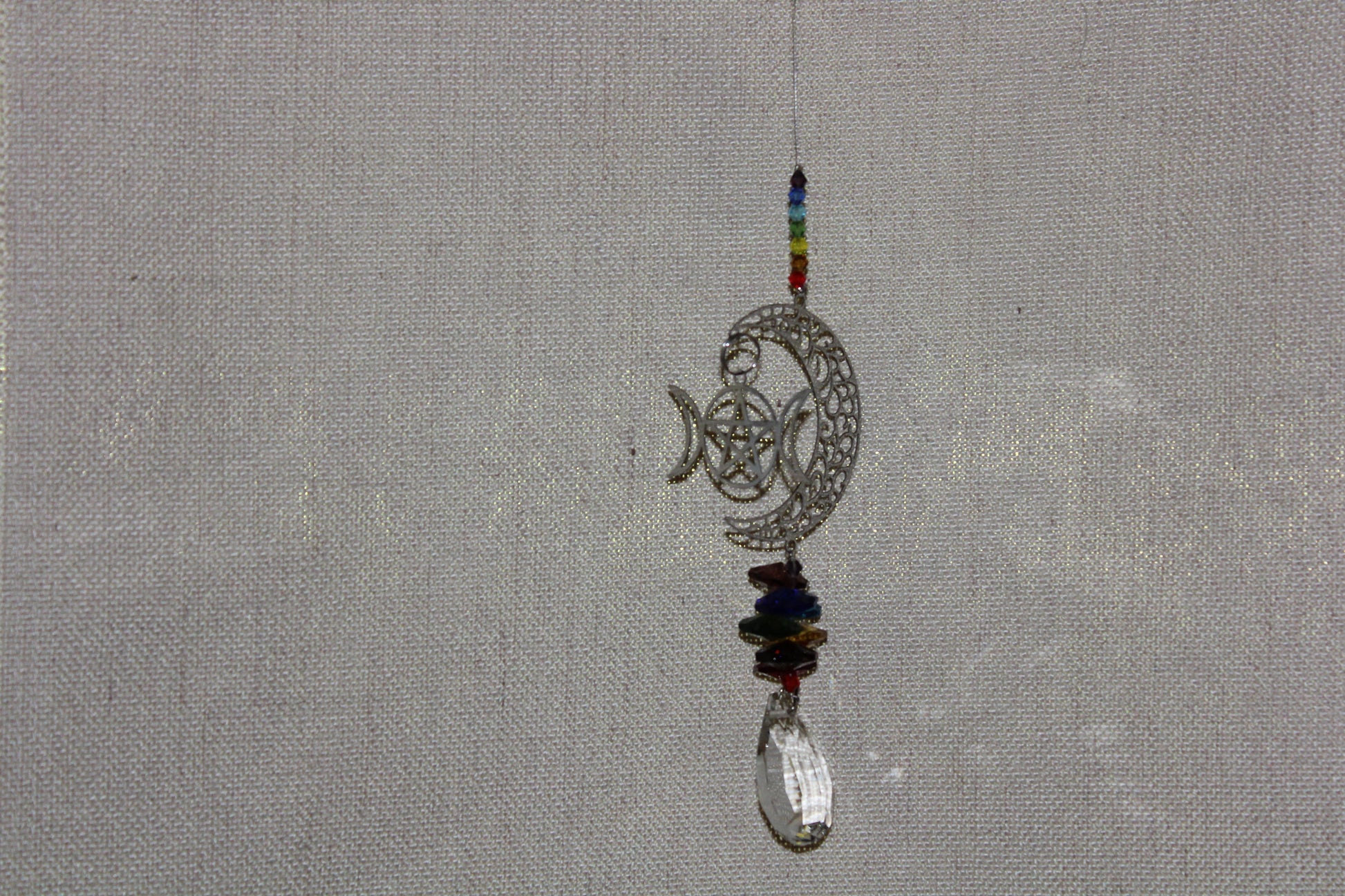 This Wiccan design suncatcher has a filigree moon and moon/star/moon with chakra beads and is approx. 23cm long.