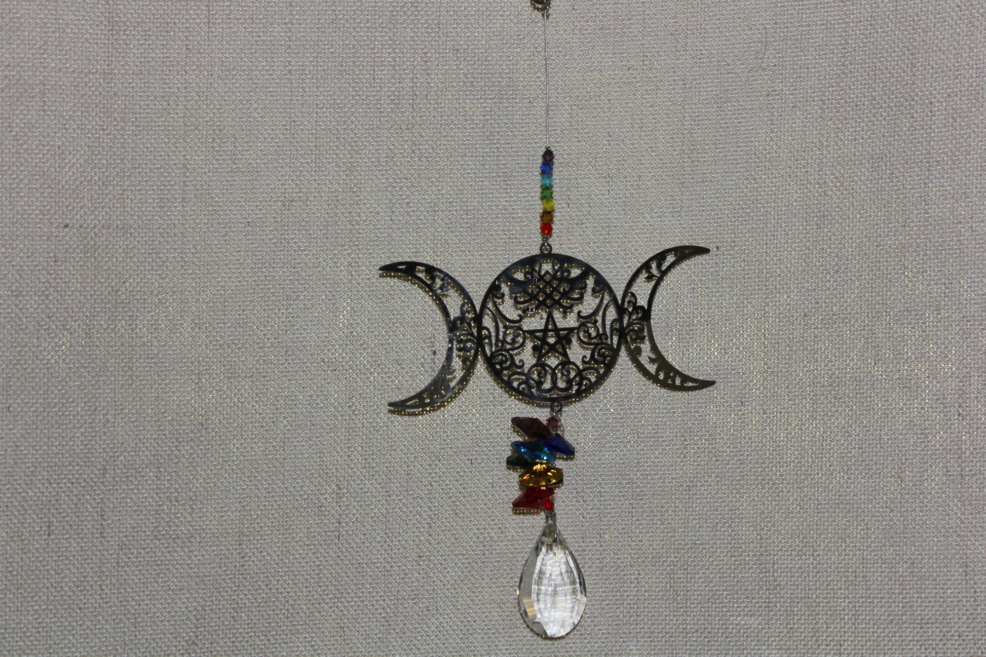 This Wiccan design suncatcher has a filigree moon/star/moon with chakra beads and is approx. 23cm long.