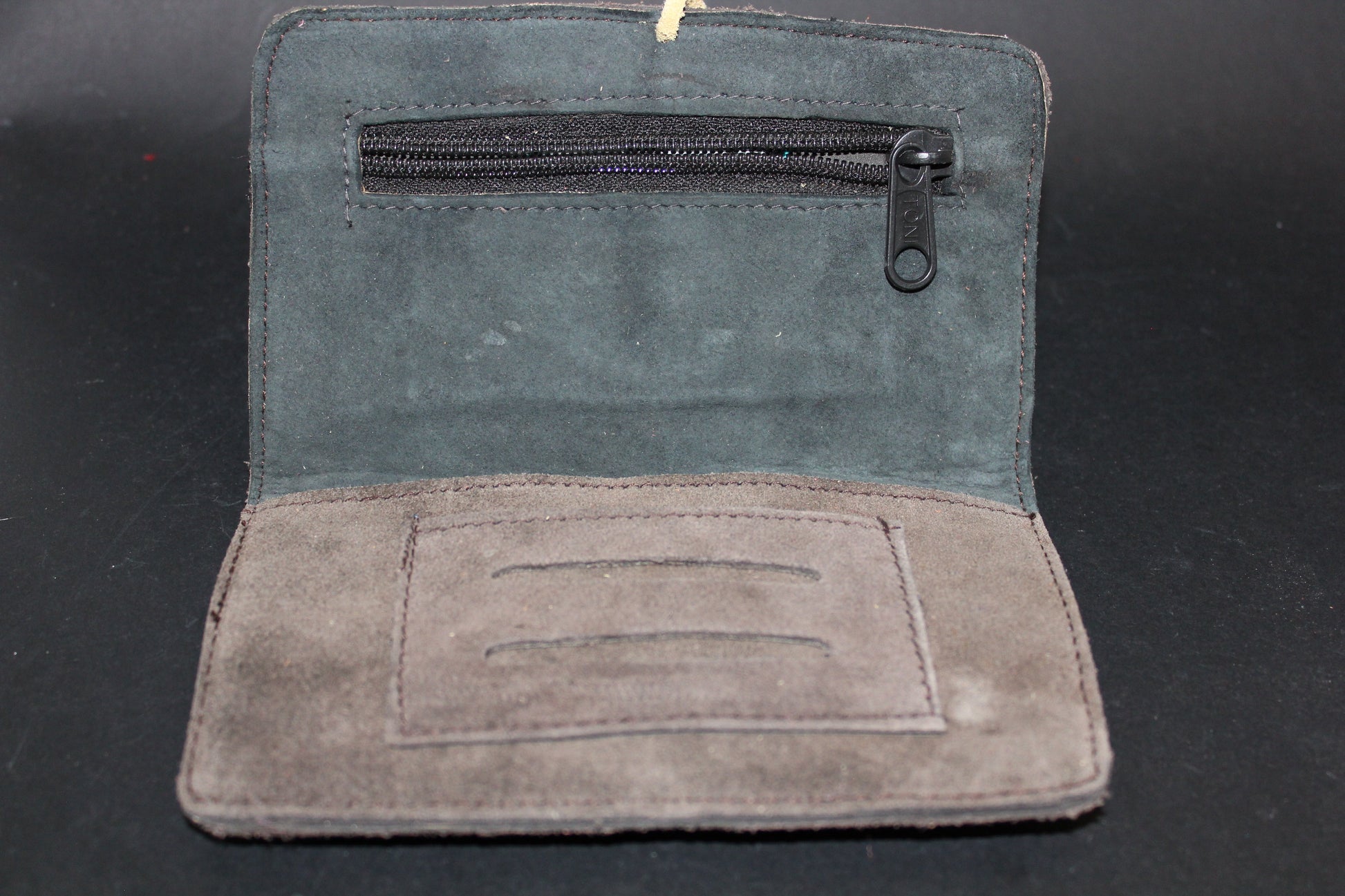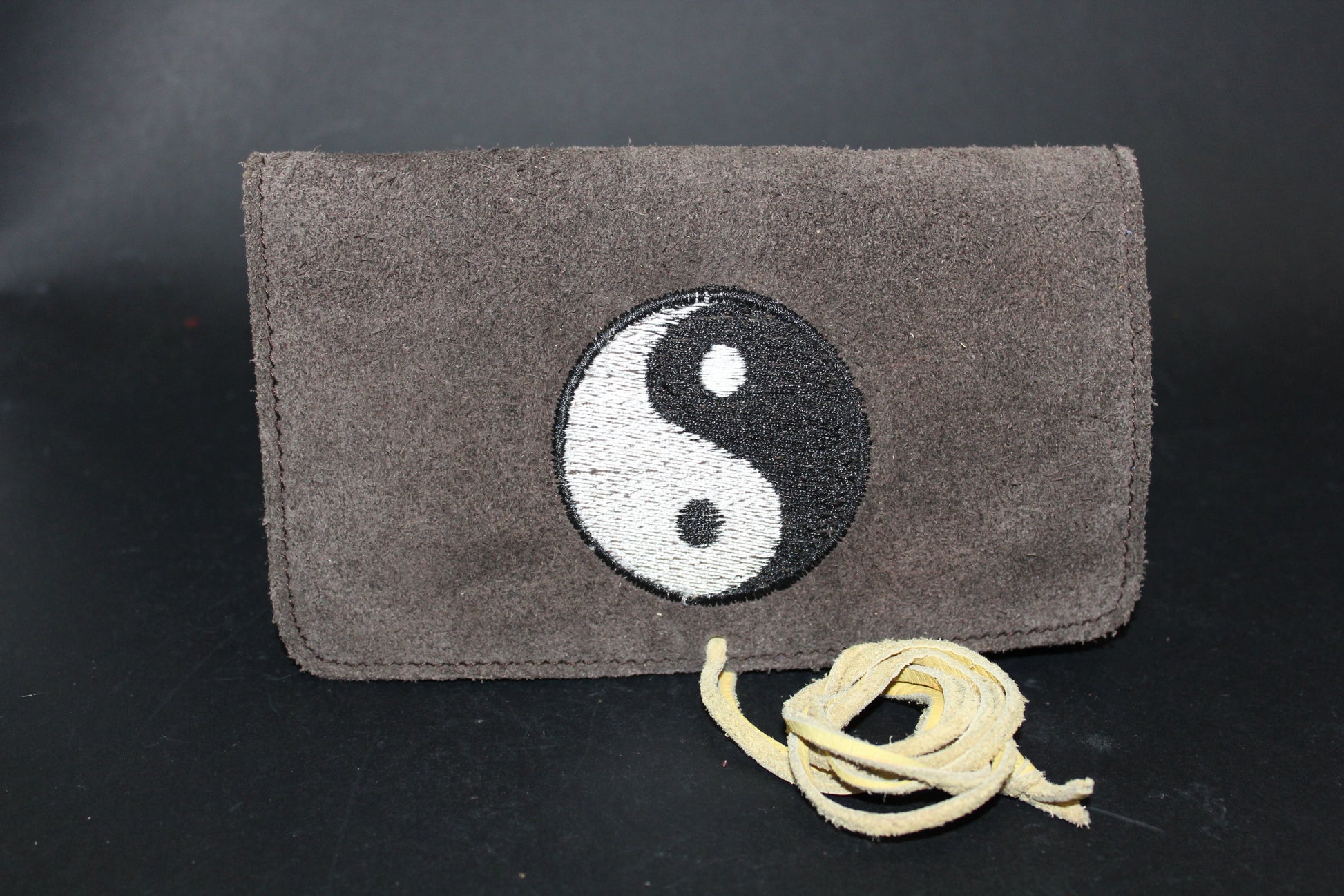 This Suede Leather wallet has 1 zippered coin and 1 open bills compartment and is embroidered with the Yin/Yang symbol - 160mm x 90mm.