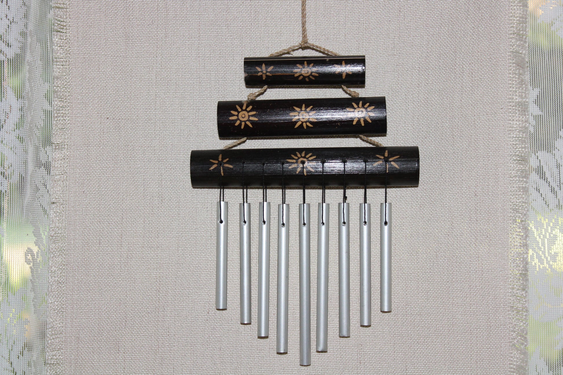 This windchime has 3 carved bamboo tubes (sideways) with 9 metal tubes below that have a light breezy melody as they play in the wind - approx. 38cm long.