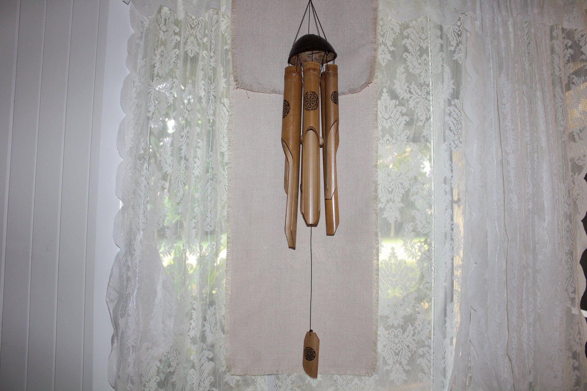 This windchime has 6 hollow bamboo tubes hanging from a coconut shell. The timber chime ensures a deeply relaxing and grounding sound as the play in the wind - approx. 115cm long.